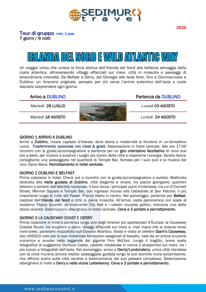 Irlanda del Nord e Wild Atalntic Way da Dublino di martedì 7 giorni